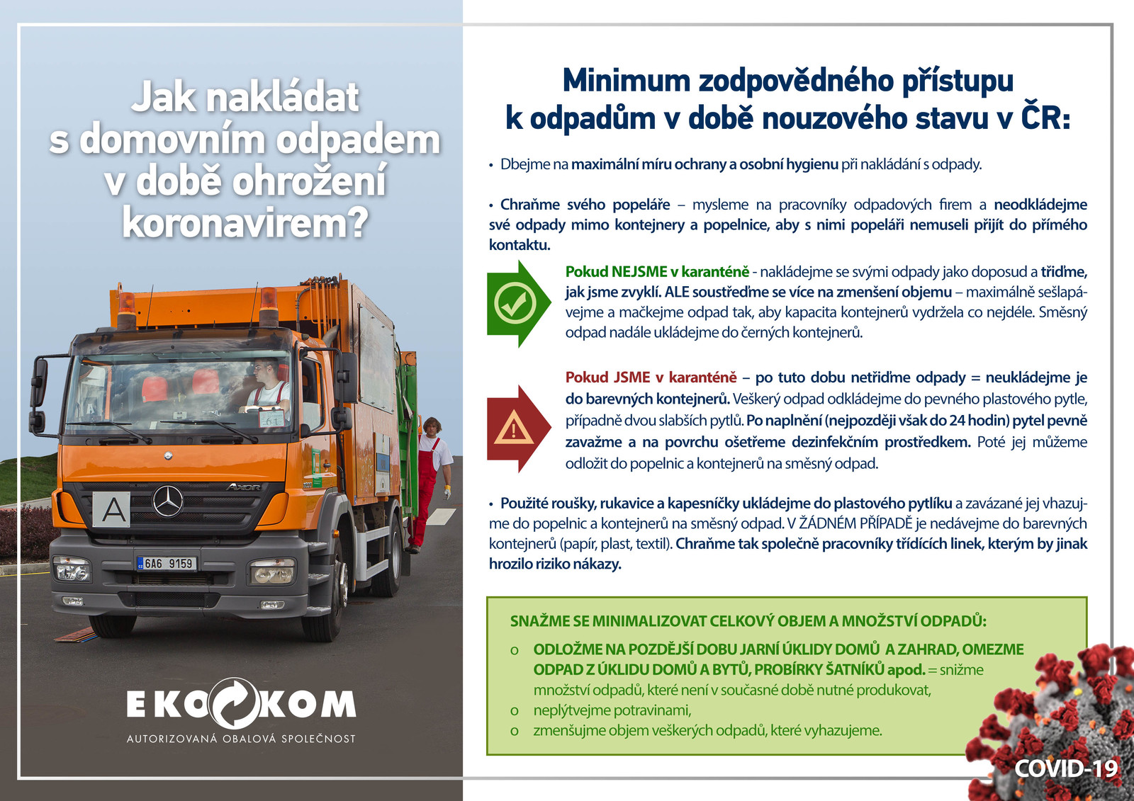 v současné nelehké době, kdy společně bojujeme proti epidemii koronaviru (Covid-19) nesmíme zapomínat na odpovědné nakládání s domovními odpady. Chovejme se proto zodpovědně nejen sami k sobě a svému okolí, ale také ke všem lidem, kteří pro nás zajišťují nakládání s odpady. Bez jejich práce a nasazení by nakládání s odpady nemohlo dále bezpečně a efektivně fungovat a naše obec by nezůstala čistá a bez odpadků.