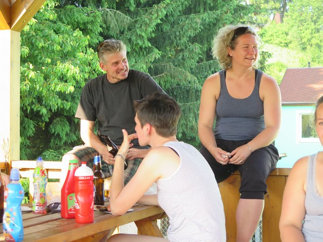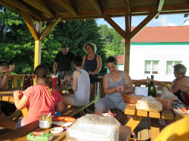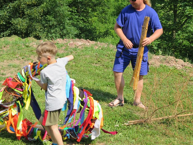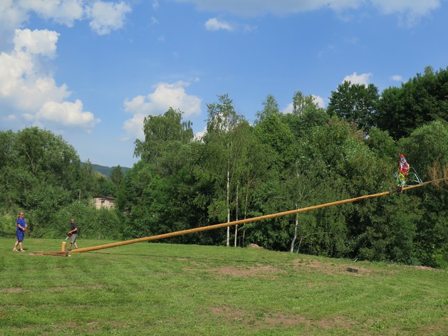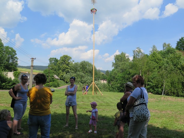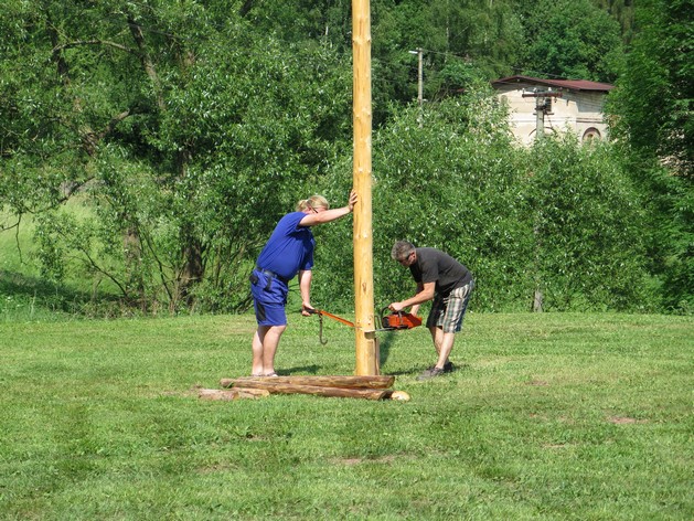 V den „Kácení máje“ 31 . května 2018 bylo pravé červencové počasí – slunečno a ve stínu 30°C. Ne každý byl připraven na saharské vedro a tak se nás sešlo méně než vloni. Ale práce nám šla od ruky a v krátké době pánové Ondra a Tonda složili májku přesně na určené místo a my ostatní ji odstrojili. Pak nás Renata pozvala k ohništi, kde jsme si s dětmi opekli donesené uzeniny a v příjemném prostředí pobesedovali o životě.