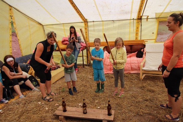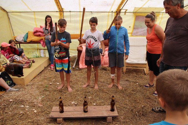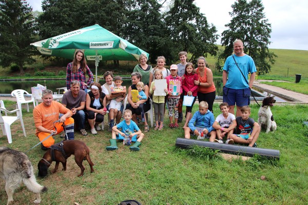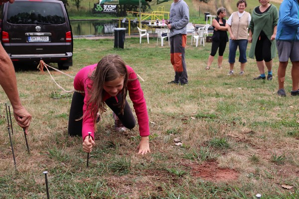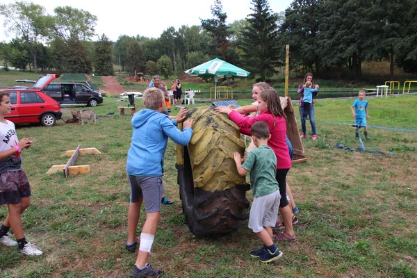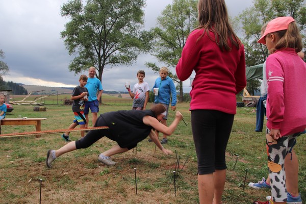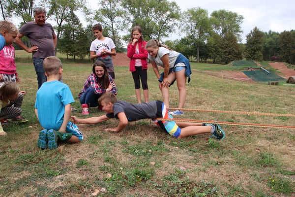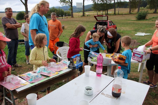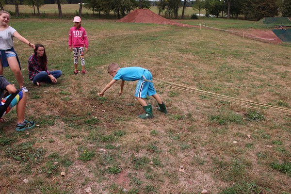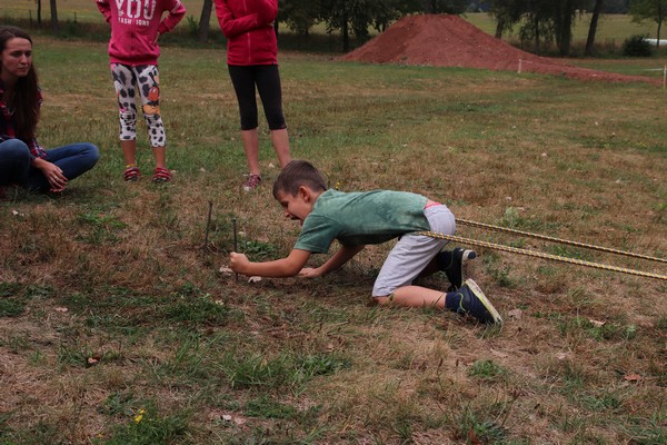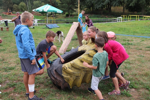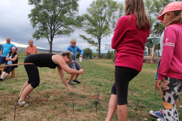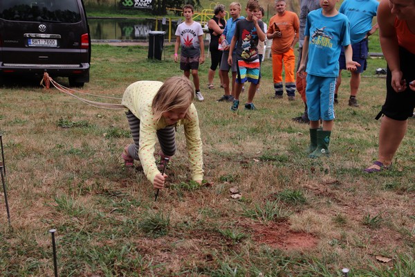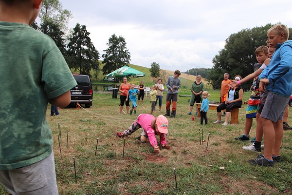 Také letos obec zajistila pro děti zábavné odpoledne na ukončení prázdnin. Sešli jsme se na zastávce u odbočky na Janovičky ve 14 hodin. Za chviličku po našem odchodu začalo pršet a tak jsme museli pod střechu. To nás neodradilo a už za deset minut znovu vyrážíme. U Bangů děti plní první úkol – vytvořit gordický úkol. A ten se povedl! Na dalším stanovišti nás čeká nové zadání - vytvořit dvě družstva napodobit zaměstnání dospělých. Ostatní musí uhodnout, o jakou činnost jde. I to se zdařilo – viděli jsme sestřičky jako ošetřují poranění a kluky, jak chytají nebezpečného zloděje. A zase prší! Les nás uchránil a za chvíli už pokračujeme na cestě za tajeným cílem. Za pár minut docházíme na „Koupálo“, kde pro nás BCB Broumov připravil velmi nápadité soutěžní hry, které zaujaly. Děti byly tak soutěživé a hry přitažlivé, že zaujaly dospělý doprovod a soutěžili všichni. Náš přítel, déšť, znovu spustil svoje kapky. Pan Karel F. z BCB Broumov byl však připraven a my se ihned přesunuli do velkého stanu, kde děti dostaly do ruky tyčku s provázkem a hřebíkem a lahev s pěkně úzkým hrdlem. Na fotografiích uvidíte jak si s „rybářským prutem“ poradily. A dospělí neodolali. Po krátkém dešti (pak už nepršelo i sluníčko vysvitlo) děti splnily třetí úkol, z nalezeného přírodního materiálu vytvořit první písmeno svého jména. Pak už se všichni ponořili do her a soutěží – postřeh, síla, obratnost a chytrost, to byly hlavní prvky, které bylo třeba uplatnit.
