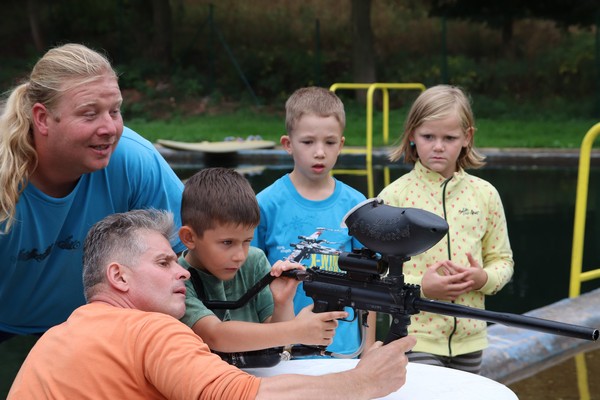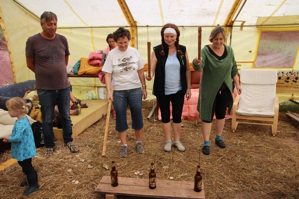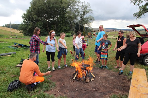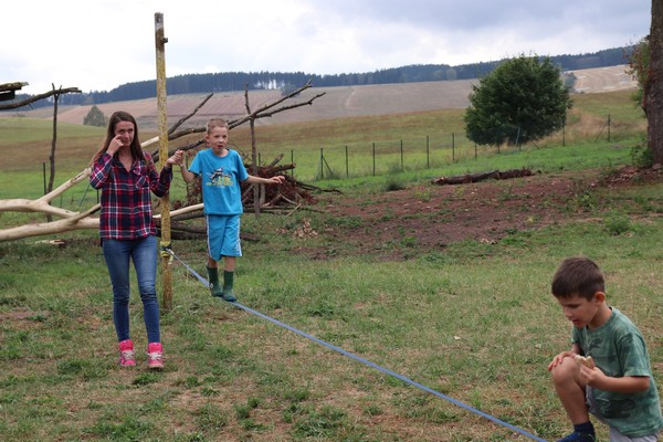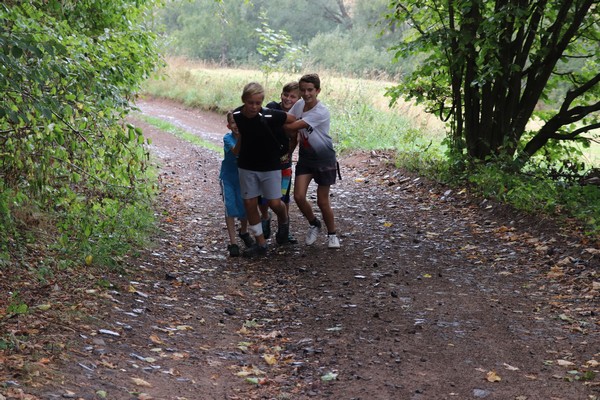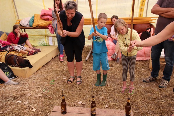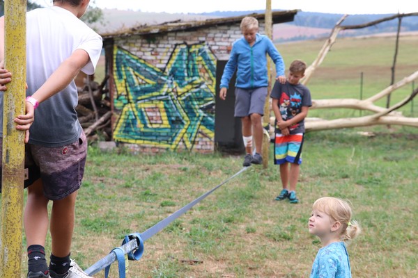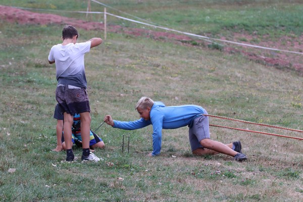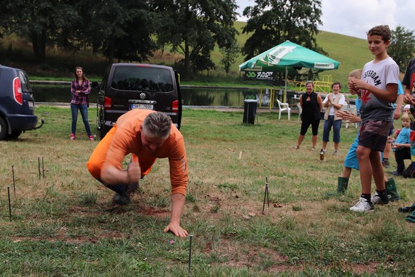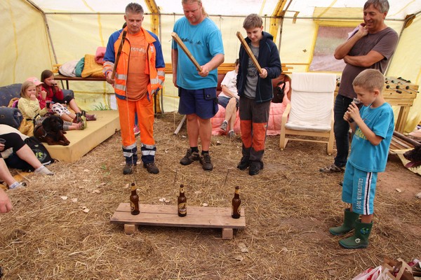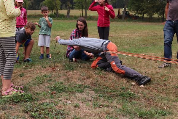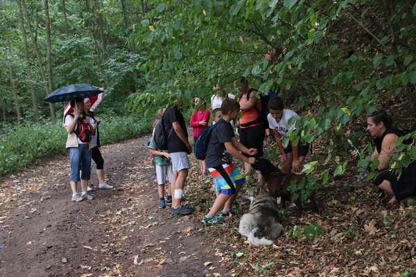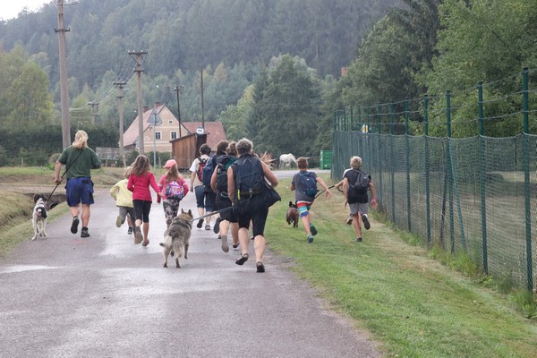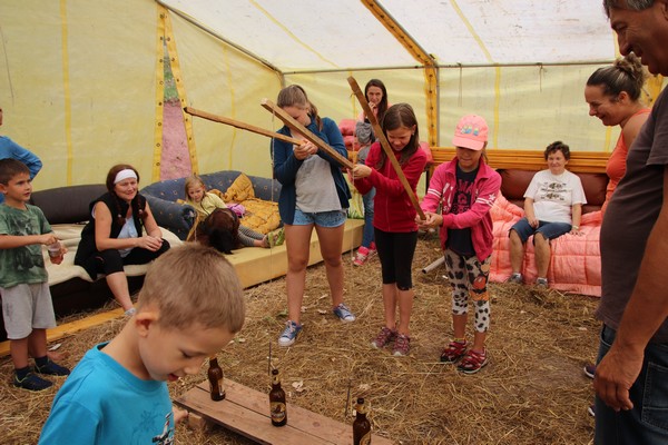 Také letos obec zajistila pro děti zábavné odpoledne na ukončení prázdnin. Sešli jsme se na zastávce u odbočky na Janovičky ve 14 hodin. Za chviličku po našem odchodu začalo pršet a tak jsme museli pod střechu. To nás neodradilo a už za deset minut znovu vyrážíme. U Bangů děti plní první úkol – vytvořit gordický úkol. A ten se povedl! Na dalším stanovišti nás čeká nové zadání - vytvořit dvě družstva napodobit zaměstnání dospělých. Ostatní musí uhodnout, o jakou činnost jde. I to se zdařilo – viděli jsme sestřičky jako ošetřují poranění a kluky, jak chytají nebezpečného zloděje. A zase prší! Les nás uchránil a za chvíli už pokračujeme na cestě za tajeným cílem. Za pár minut docházíme na „Koupálo“, kde pro nás BCB Broumov připravil velmi nápadité soutěžní hry, které zaujaly. Děti byly tak soutěživé a hry přitažlivé, že zaujaly dospělý doprovod a soutěžili všichni. Náš přítel, déšť, znovu spustil svoje kapky. Pan Karel F. z BCB Broumov byl však připraven a my se ihned přesunuli do velkého stanu, kde děti dostaly do ruky tyčku s provázkem a hřebíkem a lahev s pěkně úzkým hrdlem. Na fotografiích uvidíte jak si s „rybářským prutem“ poradily. A dospělí neodolali. Po krátkém dešti (pak už nepršelo i sluníčko vysvitlo) děti splnily třetí úkol, z nalezeného přírodního materiálu vytvořit první písmeno svého jména. Pak už se všichni ponořili do her a soutěží – postřeh, síla, obratnost a chytrost, to byly hlavní prvky, které bylo třeba uplatnit.
