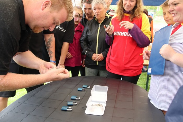 První disciplína – Najdi správný klíč ( zámky a přehršle klíčů), 2. Policista v akci ( odchyt „zlého“ psa a umístit na bezpečné místo), 3. Cestou necestou krásami našeho kraje (na starobylém kole po Schrollově parku a v pěti zastaveních přečíst, zapamatovat a pak sdělit rozhodčím název památky a to vše na čas). Poznámka: Rozhodčí musili nasadit druhé kolo, zdatní závodníci první brzo „strhli“. 4. Překážkový běh (týmový štafetový závod), 5. Lentilky (brčkem přemístit a roztřídit lentilky podle barev), 6. Kostky ( sčítal se nejvyšší počet bodů každého závodníka), 7. Virtuální realita (virtuální plavba pod vodou a proplouvání kruhy).