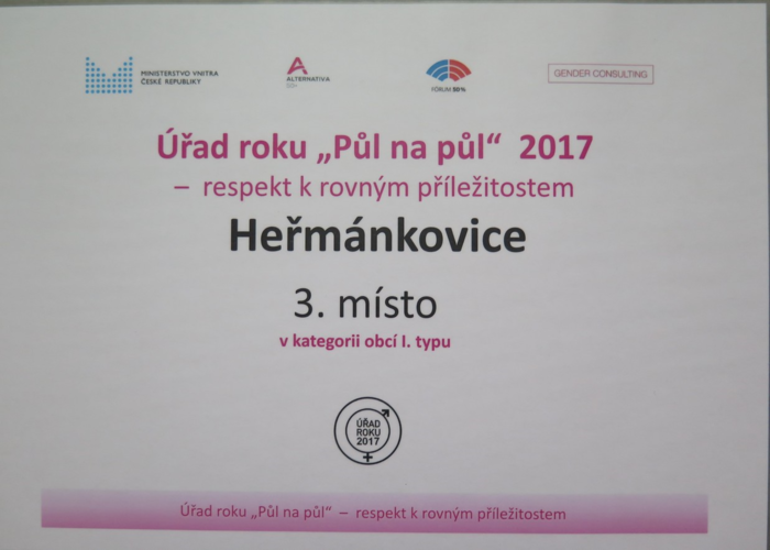 V roce 2016 obdržela obec od ministerstva vnitra dotazník – Úřad roku „ Půl na půl „ – respekt k rovným příležitostem pro kraje a obce všech typů. V dotazníku naše obec představila, jakým způsobem jsou u nás vytvářeny rovné podmínky pro muže , ženy, ale v podstatě pro všechny věkové kategorie. Důležitá byla vyváženost pro všechny – akce pro děti, seniory, pro celé rodiny apod. Za všechny uskutečněné akce a dění v naší obci jsme se v rámci ČR v kategoríi obcí I. typu umístili na třetím místě.