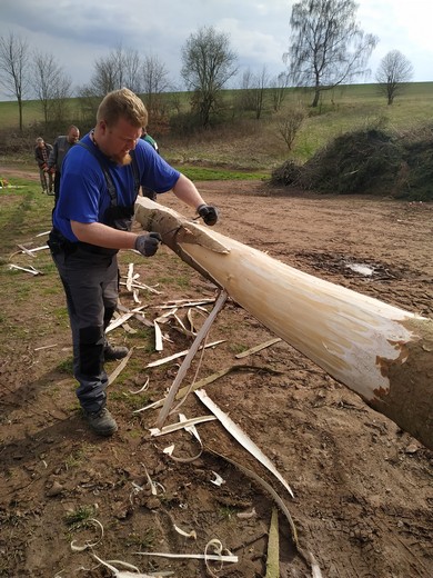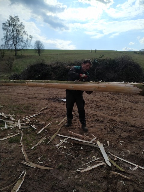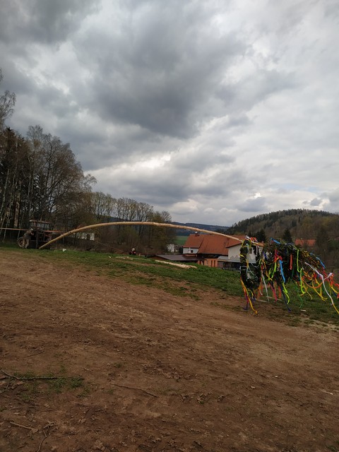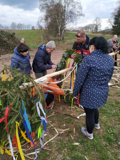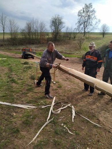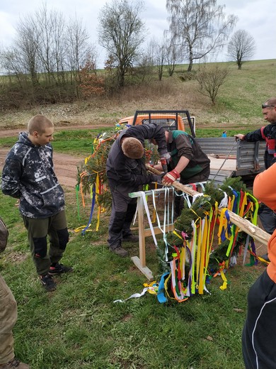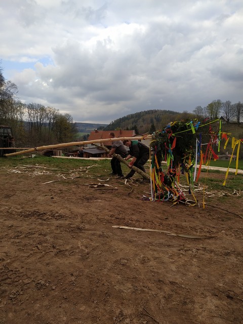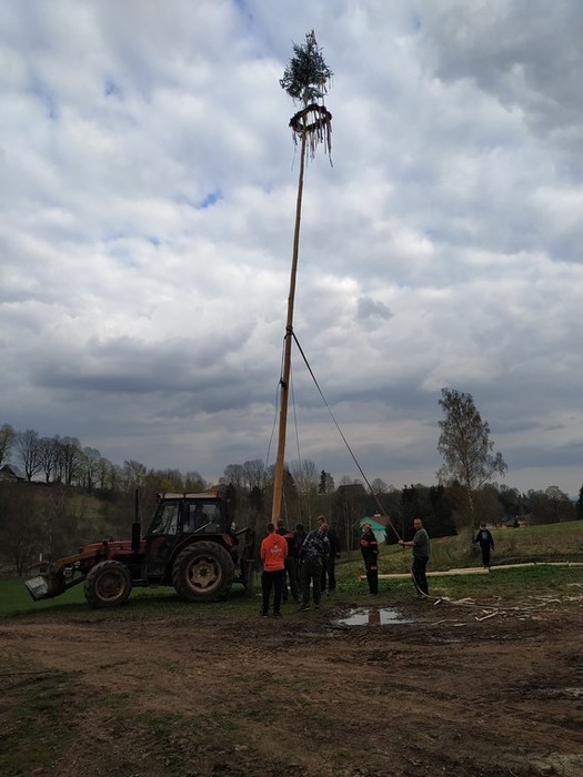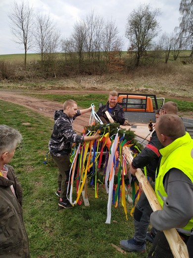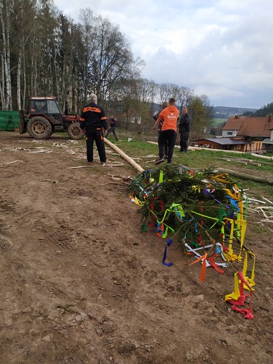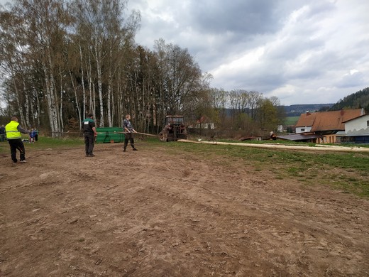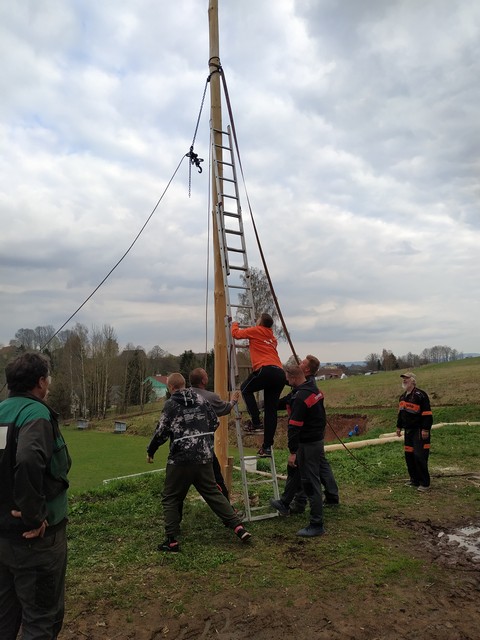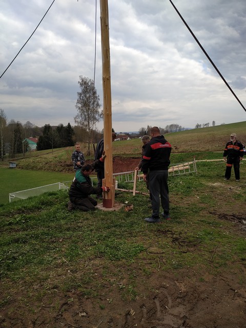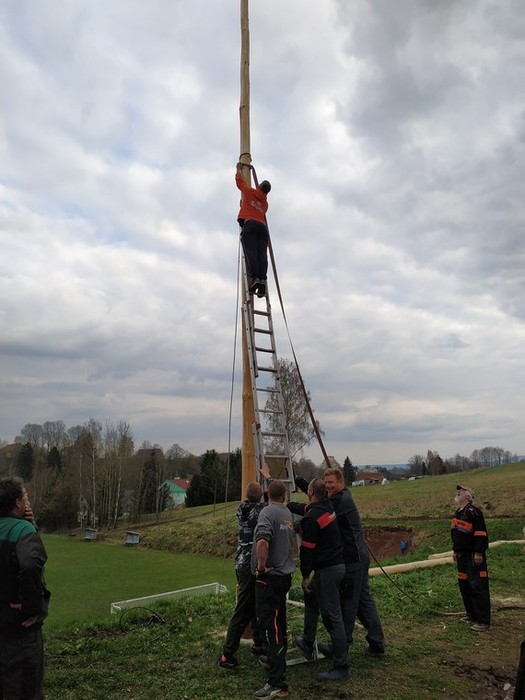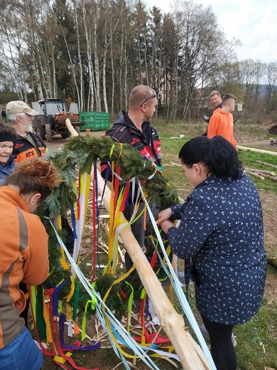 Odpoledne ve středu 27. dubna jsme se sešli za fotbalovým hřištěm, že si konečně po dvou letech opět postavíme májku. Chlapi z TS ji dopoledne připravili a dovezli na místo určení. Odpoledne ženy nazdobily smrček a věnec barevnými pentlemi. Výzdoba byla připravena a teď přišla řada na naše muže, aby májku zkompletovali a postavili ji na její místo. Akce byla napínavá, chlapi měli díky covidu dvouletou odmlku a májka byla velmi dlouhá. Stavění začalo. Po pár metrech zvedání se zlomil ozdobený smrček. Nedalo se nic dělat, májka musela k zemi a smrček se musel opravit. Ale co čert nechtěl. Při pokládání se májka zlomila. Tak a co teď? Ještě že máme schopné muže a dokáží si poradit. Po telefonické domluvě s majitelem lesíka za hřbitovem chlapi pokáceli májku novou ???? očistili ji od kůry, přidělal se věnec a smrček a mohlo se znovu stavět. Tentokrát se májka postavila bez újmy a hrdě se vztyčila nad hřiště. Chlapi ji upevnili, aby se neskácela a konečně si mohli opéct zasloužené špekáčky. Po dvouleté pauze byla akce napínavá, ale s dobrým koncem. Příští rok to bude určitě hned na poprvé ????